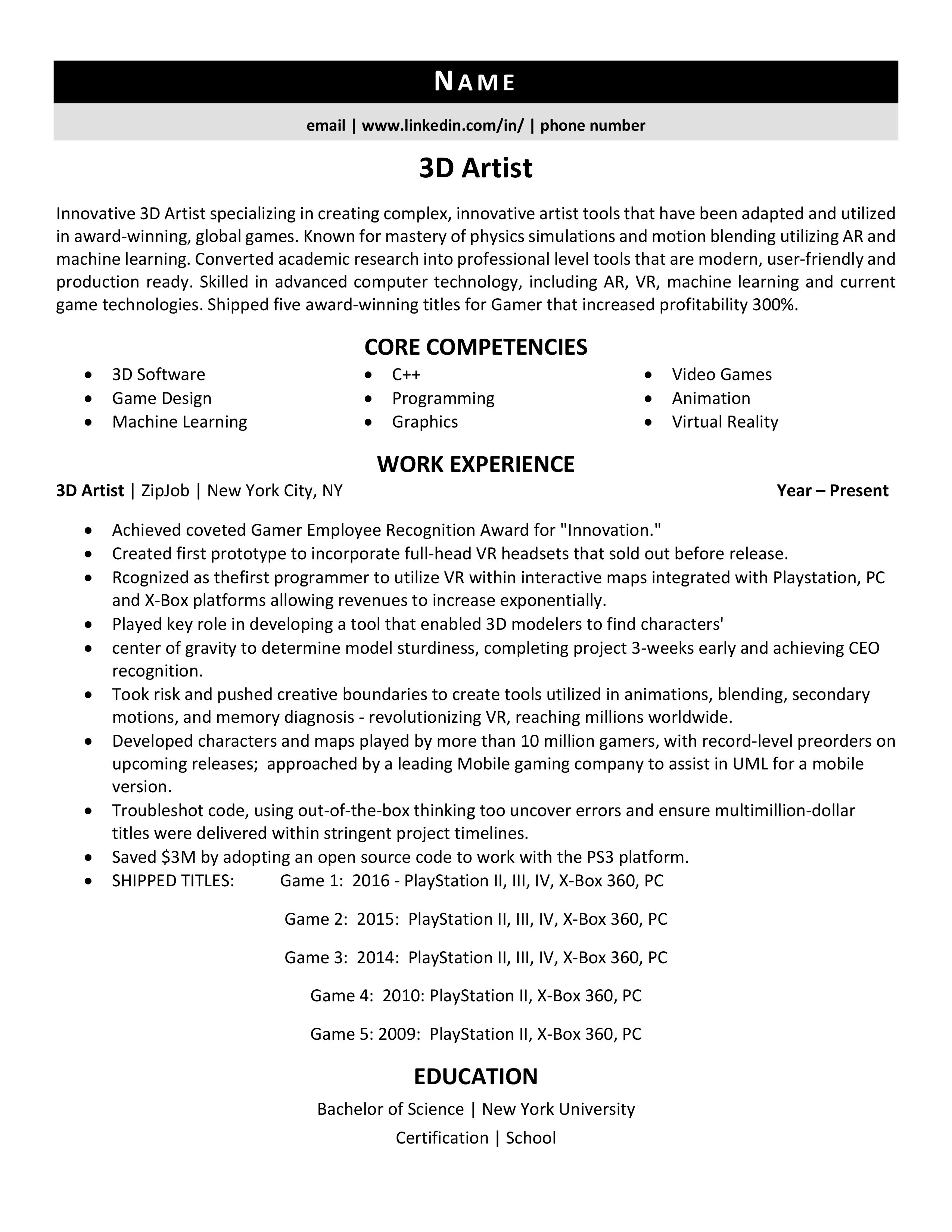 Resume Jack Yang 3d Artist from jackyang.files.wordpress.com Progressed through roles as technical illustrator and interactive multimedia developer until assuming newly formed role of 3d modeler/animator in 2002; I am a recent graduate from academy of art university, san francisco with bfa in animation and visual effects. Dear hiring manager, moments ago, i went through all the details you have provided in your job posting which probably was posted on (write down the name of the freelancing platform) which led me to believe that you need an expert 3d artist who can perform various things. Aug 31, 2021 · upwork cover letter sample for 3d modeling, design and cad. I would like to put my name forward for your vacant position of 3d artist, which was recently advertised on the dayjob.com website. With over five year's experience of working on a large games production, i can be. 3d artists develop still or moving 3d creations using computer and film technology. 3d artist cover letter 2.